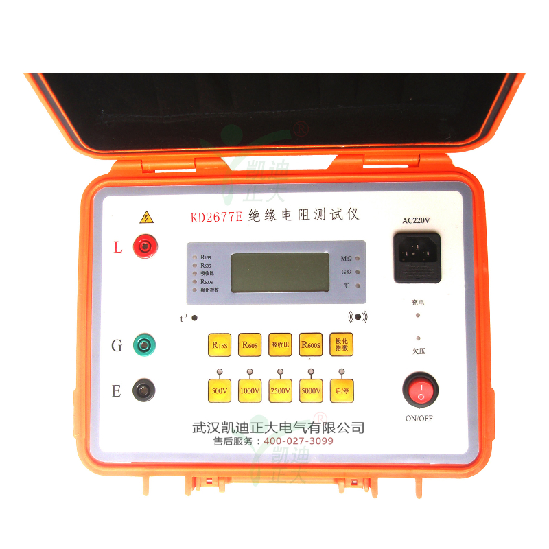 KD2677E高壓絕緣搖表是根據(jù)絕緣電阻測量的基本要求,采用較新電子電路設(shè)計(jì)而成的,其基本原理是采用電壓、電流法測量被測物的電阻值:R=V/I。機(jī)內(nèi)的存儲、運(yùn)算電路使本機(jī)可自動測量吸收比(R1min/R15s)和極化指數(shù)(R10min/R1min)。