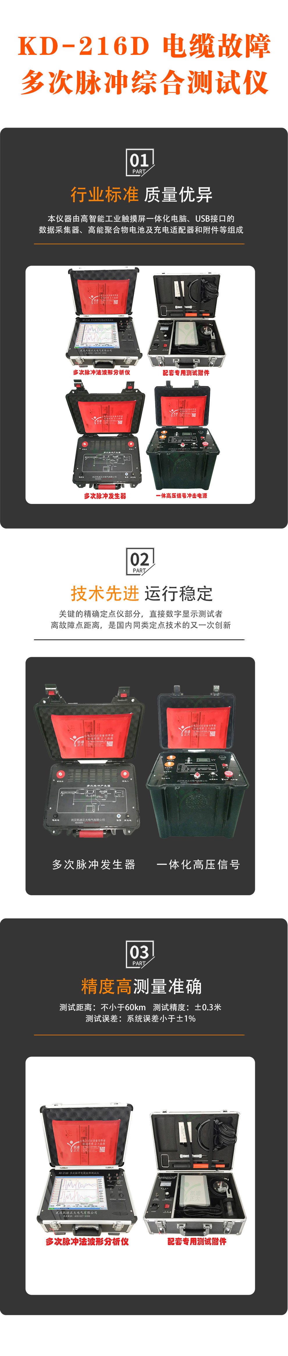 KD-216D電纜故障多次脈沖綜合測試儀是迎合工業(yè)級電力行業(yè)方案和IT時(shí)代的快速發(fā)展,將原來電纜故障測試儀的局限性,用工控嵌入式計(jì)算機(jī)平臺系統(tǒng)、網(wǎng)絡(luò)服務(wù)業(yè)務(wù)、USB通信技術(shù)系統(tǒng)化,很大提高了儀器的使用功能和利用價(jià)值以及便捷的現(xiàn)場環(huán)境操作。特別對于日益增多的地埋電纜資料提供了一套少有的管理軟件。整套系統(tǒng)滿足中華人民共和國電力行業(yè)標(biāo)準(zhǔn)《DL/T849.1~DL/T849.3-2004》電力設(shè)備專用測試儀器通用技術(shù)條件,該系統(tǒng)測試由系統(tǒng)主機(jī)和故障定位儀以及電纜路徑儀三部分組成,用于電力電纜各類故障的測試,電纜路徑、電纜埋設(shè)深度的尋測和電纜檔案資料的日常維護(hù)管理,以及鐵路、機(jī)場信號控制電纜、和路燈電纜故障的精確測試。