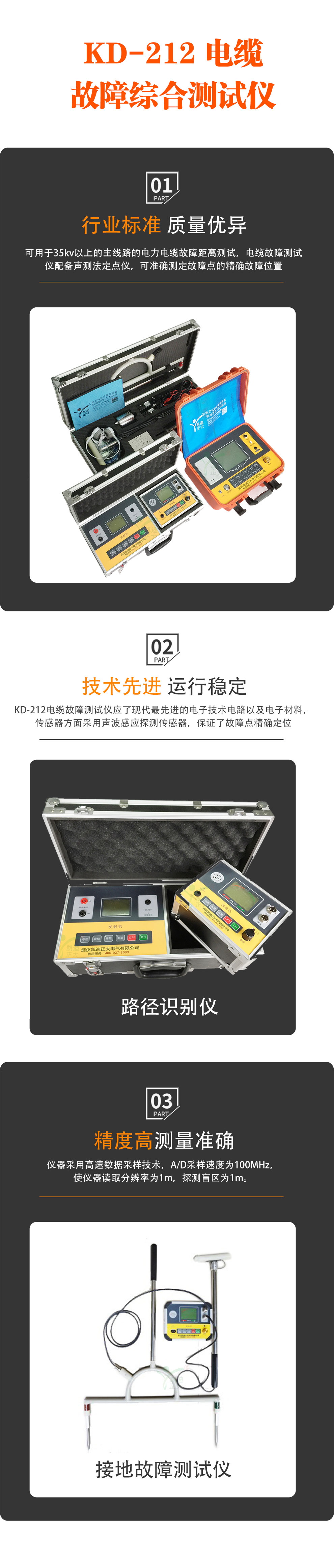 KD-212電纜故障測試儀能對地埋電力電纜故障、礦用電纜故障、通訊通信電纜故障、路燈電纜故障、高低壓電纜故障、直埋電纜故障、架空電纜故障中的開路、短路、閃絡(luò)放電故障、高阻泄漏故障、高阻閃絡(luò)故障,高低阻性的接地觸不良等故障進(jìn)行綜合分析檢測。能對電纜故障點進(jìn)行行波測量法、低壓脈沖法、脈沖電流法(直閃法、沖閃法)、弧反射法準(zhǔn)確查找、定位等。是國內(nèi)比較可靠的便攜數(shù)字式電纜故障綜合分析檢測儀器。電纜故障測試儀可用于35kv以上的主線路的故障距離測試,該電纜故障測試儀適用于測試各種型號、不同等級電壓的電力電纜及通信電纜。