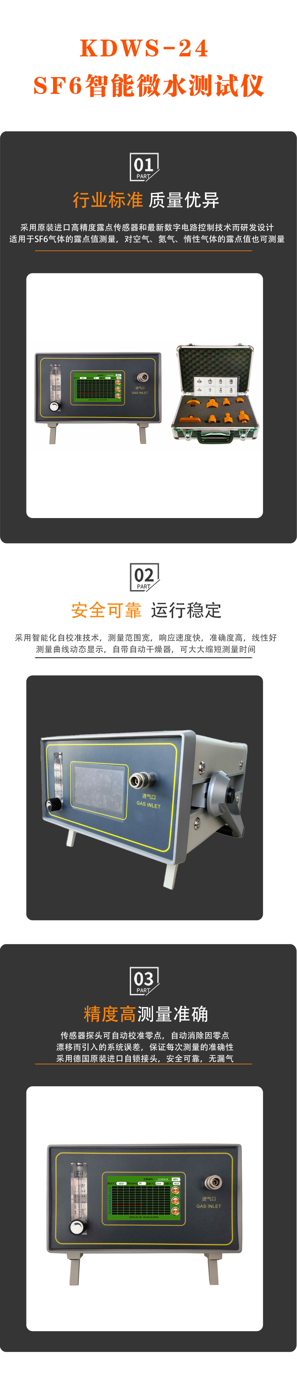 KDWS-24高精度SF6智能微水測試儀是依據(jù)國家電力行業(yè)標(biāo)準(zhǔn)DL/T506-2007《六氟化硫電氣設(shè)備中絕緣氣體濕度測量方法》,采用原裝進(jìn)口高精度露點(diǎn)傳感器和較新數(shù)字電路控制技術(shù)而研發(fā)設(shè)計(jì)的,是測量SF6氣體中微量水分含量的高精度智能型儀器。