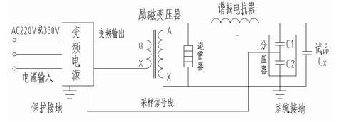 我們已知,在回路頻率f=1/2π√LC時(shí),回路產(chǎn)生諧振,此時(shí)試品上的電壓是勵(lì)磁變高壓端輸出電壓的Q倍,Q為系統(tǒng)品質(zhì)因素,即電壓諧振倍數(shù),一般為幾十到一百以上。先通過(guò)調(diào)節(jié)變頻電源的輸出頻率使回路發(fā)生串聯(lián)諧振。再在回路諧振的條件下調(diào)節(jié)變頻電源輸出電壓使試品電壓達(dá)到試驗(yàn)值,由于回路的諧振,變頻電源較小的輸出電壓就可在試品CX上產(chǎn)生較高的試驗(yàn)電壓。