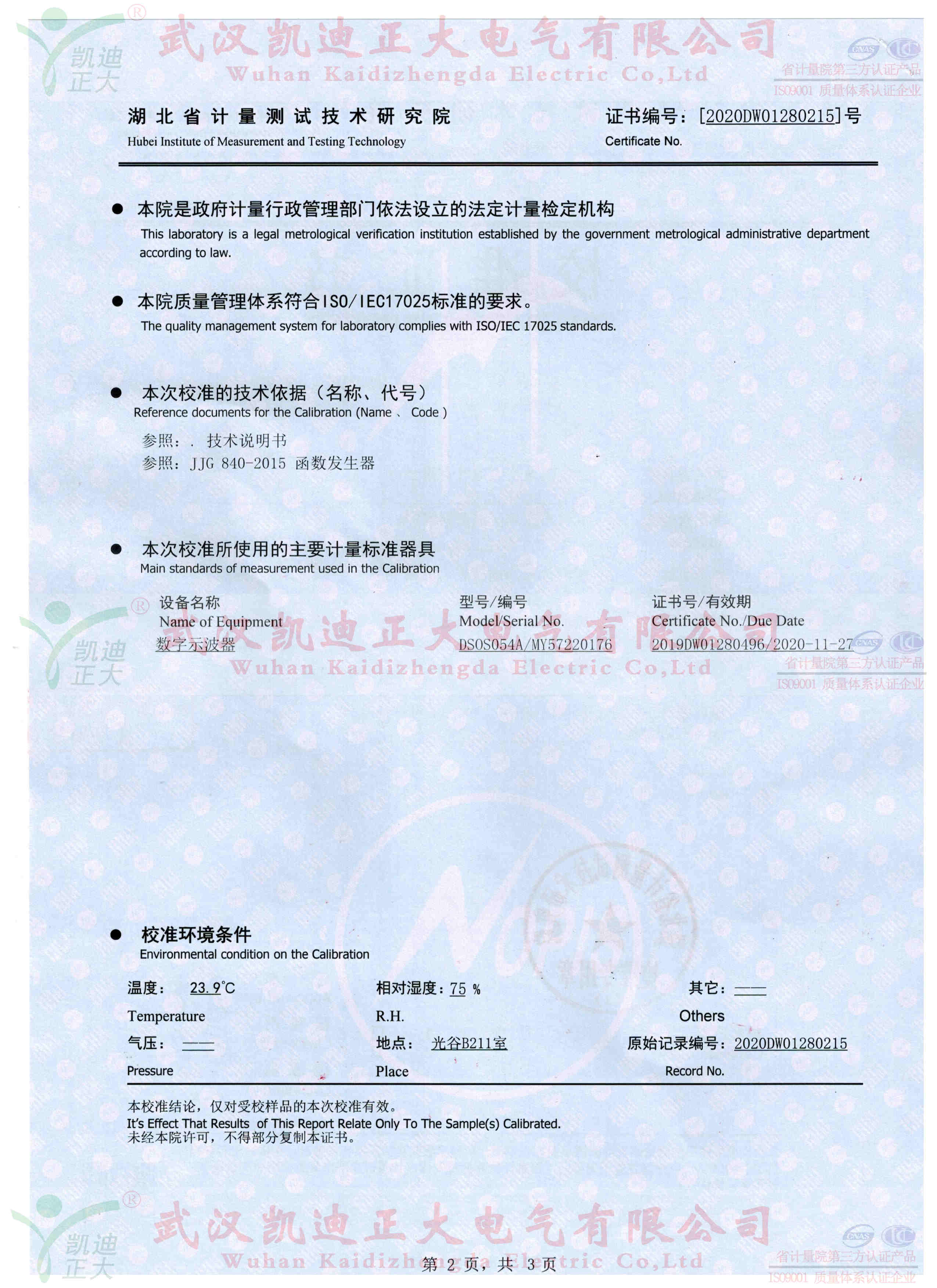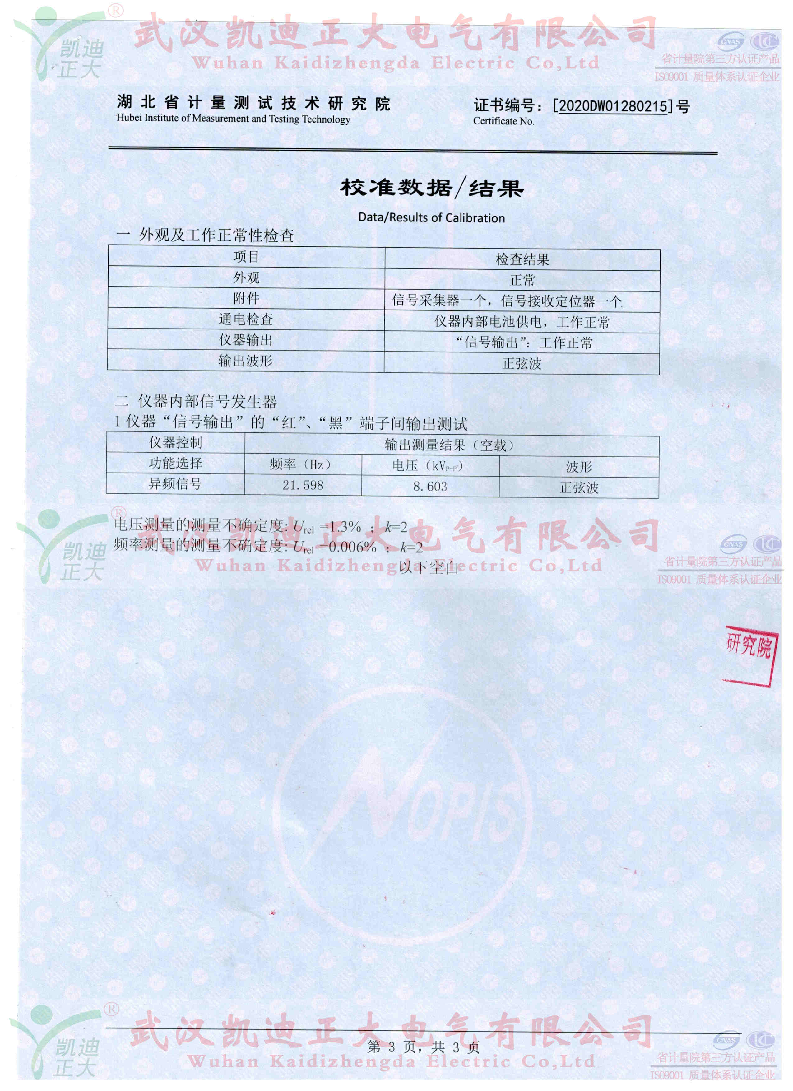 我司抽檢10套10kV配網(wǎng)單相接地故障定位儀送往湖北省計量測試技術(shù)研究院校準,獲得電學所檢測設(shè)備DS0S054A數(shù)字示波器標準設(shè)備的數(shù)據(jù):輸出波形正玄波、異頻信號21.598Hz、輸出電壓8.603kV、頻率測量的不確定度0.006%。符合武漢凱迪正大公司和國家電力規(guī)程標準。