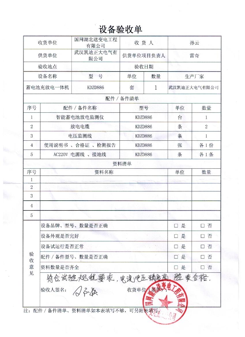 國網(wǎng)湖北送變工程有限公司驗收我司KDZD886蓄電池充放電一體機一套