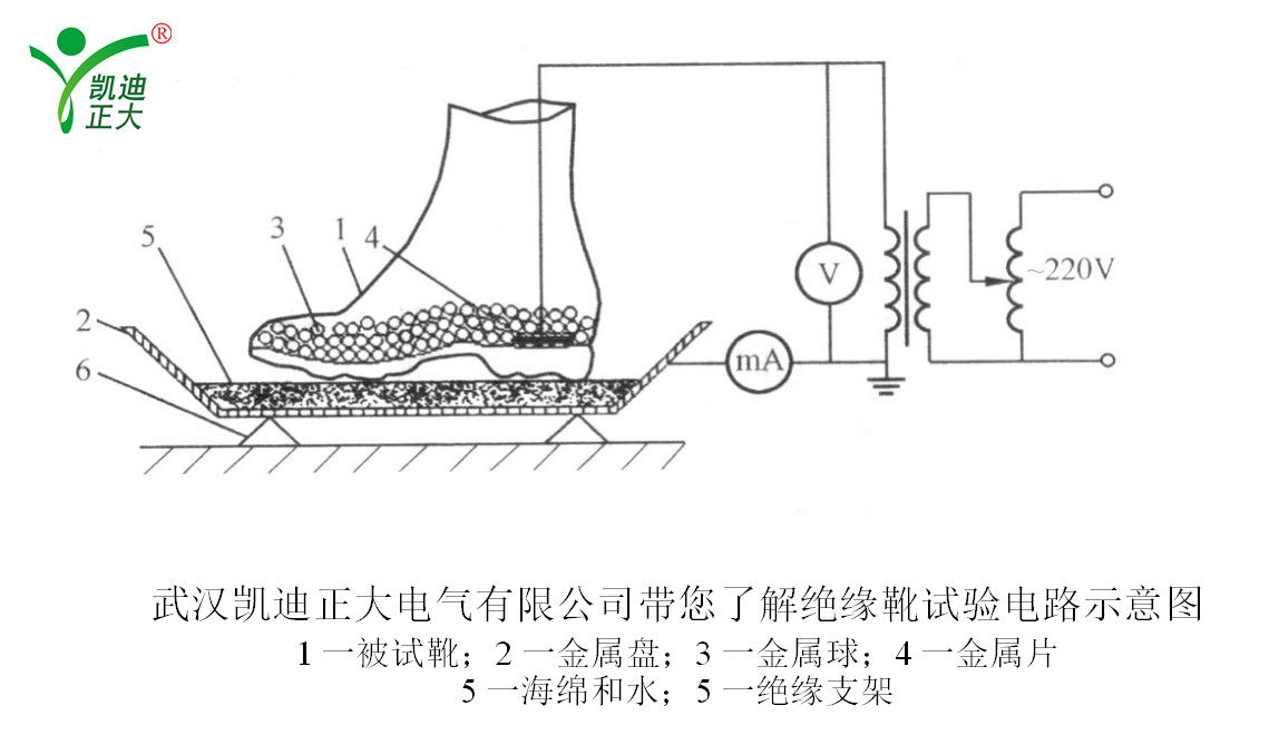 將一個(gè)與試樣鞋號一致的金屬片為內(nèi)電極放人鞋內(nèi),金屬片上鋪滿直徑不大于4mm的金屬球,其高度不小于15mm,外接導(dǎo)線焊一片直徑大于4mm的銅片,并埋入金屬球內(nèi)。外電極為置于金屬器內(nèi)的浸水海棉,試驗(yàn)電路見圖。