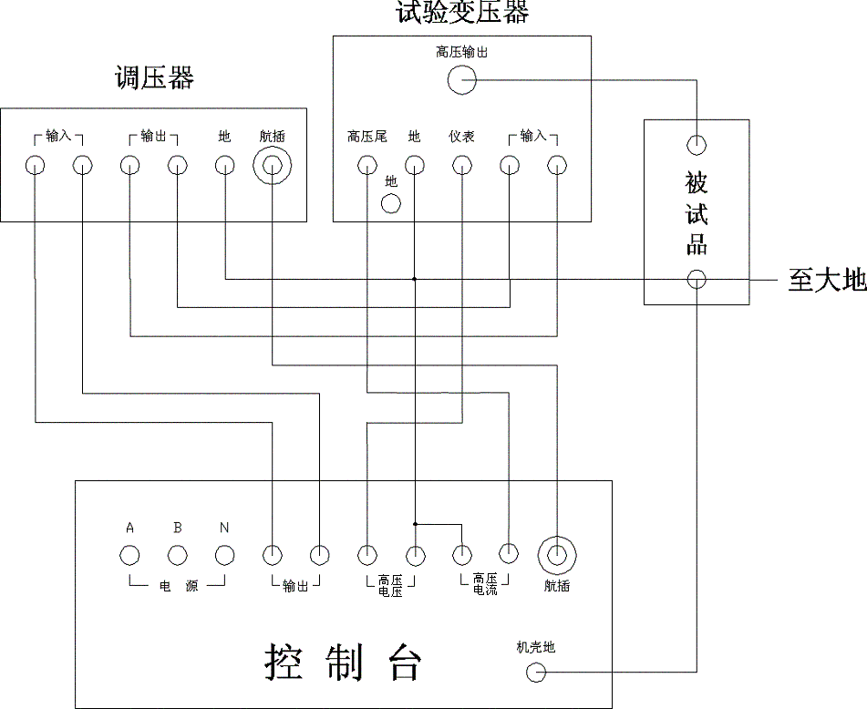 a) 按上圖所示將電源(兩相380V及零線)、TCWJH控制臺、調(diào)壓器、試驗(yàn)變壓器、被試品及地線連接好,在聯(lián)結(jié)調(diào)壓器至TCWJH之間的航插時,特別注航插凸出槽和凹下槽對準(zhǔn),插進(jìn)去再擰緊,千萬不要不論位置強(qiáng)行插,這樣很容易損壞航插。檢查無誤后再合上電源開關(guān)。合上電源開關(guān)后,電源指示綠燈(—HG)、零位指示黃燈(—HY)亮;如果零位指示燈不亮,則說明調(diào)壓器不在零位,此時可按“點(diǎn)動降壓”按鈕使調(diào)壓器降壓直至零位指示燈亮為止。