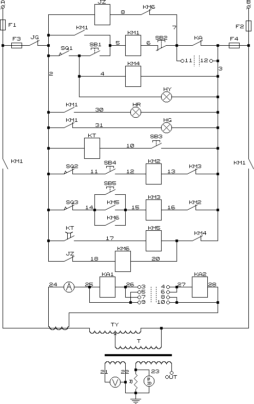 f)在升壓或耐壓過程中,如發(fā)生短路、閃絡(luò)擊穿等過流時,過流繼電器(-KA)動作,切斷主回路,調(diào)壓器自動回零,表示被試品不合格。需要指出的是在耐壓過程中出現(xiàn)過流的情況,調(diào)壓器自動回零的同時應(yīng)及時按下“計時”按鈕切除過流繼電器。