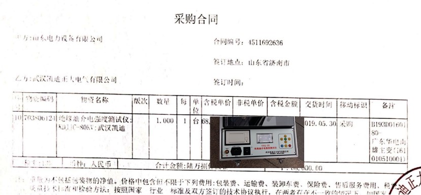 中國華電韶關(guān)熱電廠在2017年6月中旬招標(biāo)采購電氣試驗(yàn)室設(shè)備一批,我司良好的口碑獲得中國華電廣東華電南雄主變(161010510001) 物資設(shè)備需求,驗(yàn)收主變性能需求絕緣油介電強(qiáng)度測試儀;KDJJC-80KV武漢凱迪,采購合同編號:4511892636.