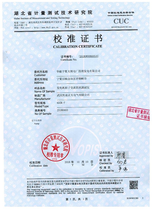 武漢凱迪正大KDZK-F發(fā)電機轉子交流阻抗測試儀校驗證書