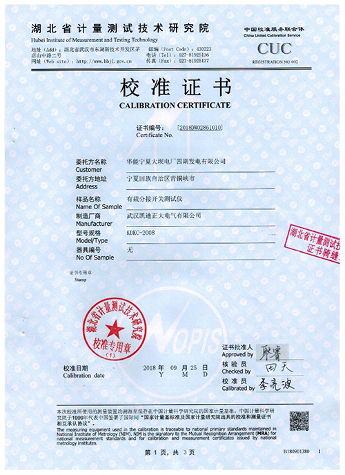 武漢凱迪正大KDKC2008有載分接開(kāi)關(guān)測(cè)試儀校準(zhǔn)證書(shū)