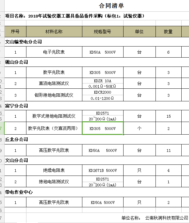 隨即,云南文山電力股份有限公司在我司生產(chǎn)的KD50A電子兆歐表,KD305數(shù)字兆歐表,KDZR-10A直流電阻測試儀,KDCR2000鉗形接地電阻測試儀,KD2671絕緣搖表,KD2571接地電阻測試儀等設(shè)備參數(shù)中看中優(yōu)于同行業(yè)電氣廠家的性能,價格優(yōu)勢、售后服務(wù)、良好的市場口碑判定中標(biāo)人云南秋滿公司。