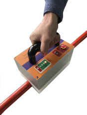(4)將檢測儀v形電極對準桿、棒、繩索并滑動使其全部通過檢測,觀察led顯示屏狀態(tài):一旦紅色的燈亮起,表示被測物體不合格,將檢測儀轉(zhuǎn)向再做幾次測試。若被測試品直徑超過39mm,將桿或管旋轉(zhuǎn)90度再做幾次測試。
