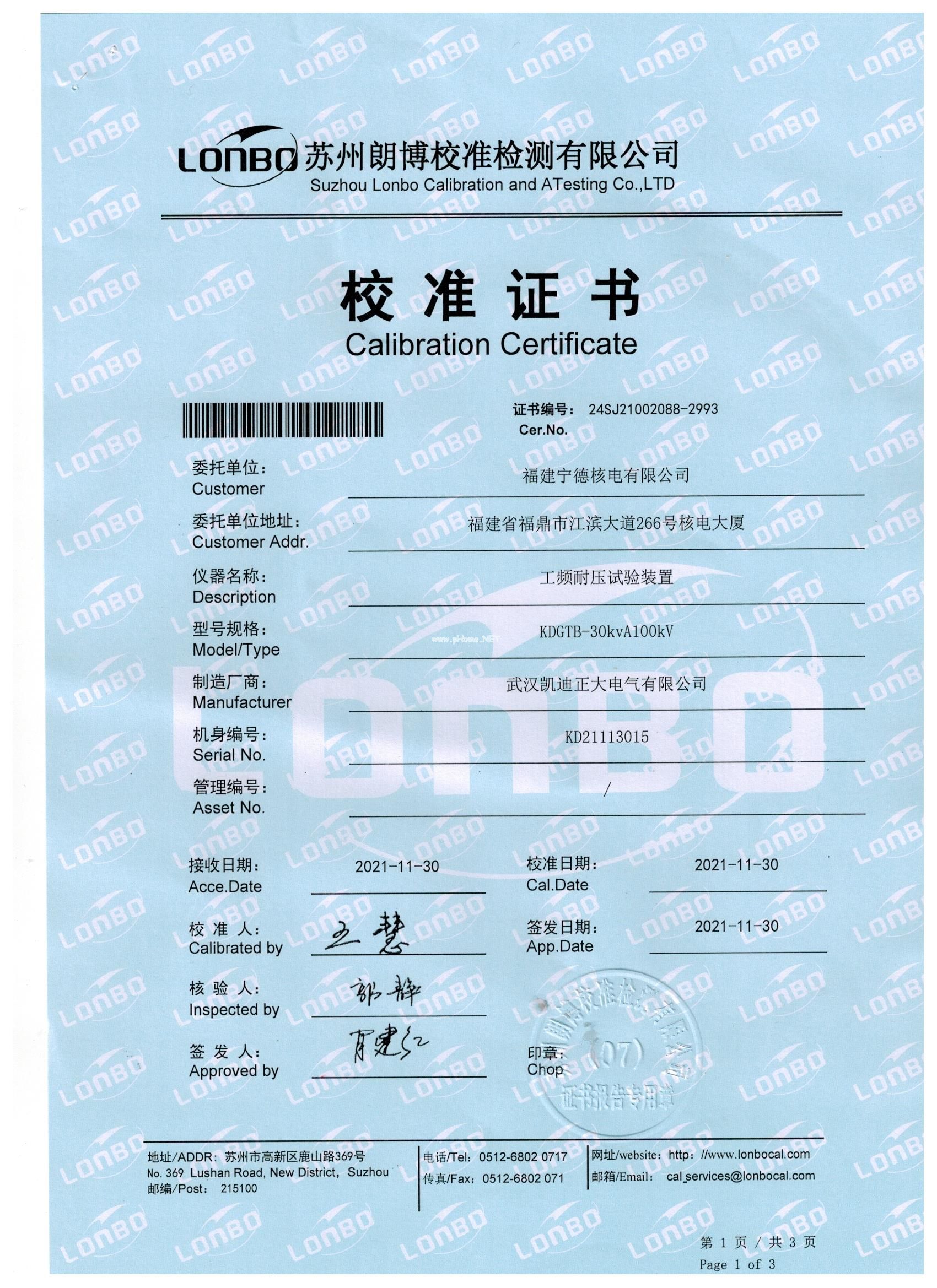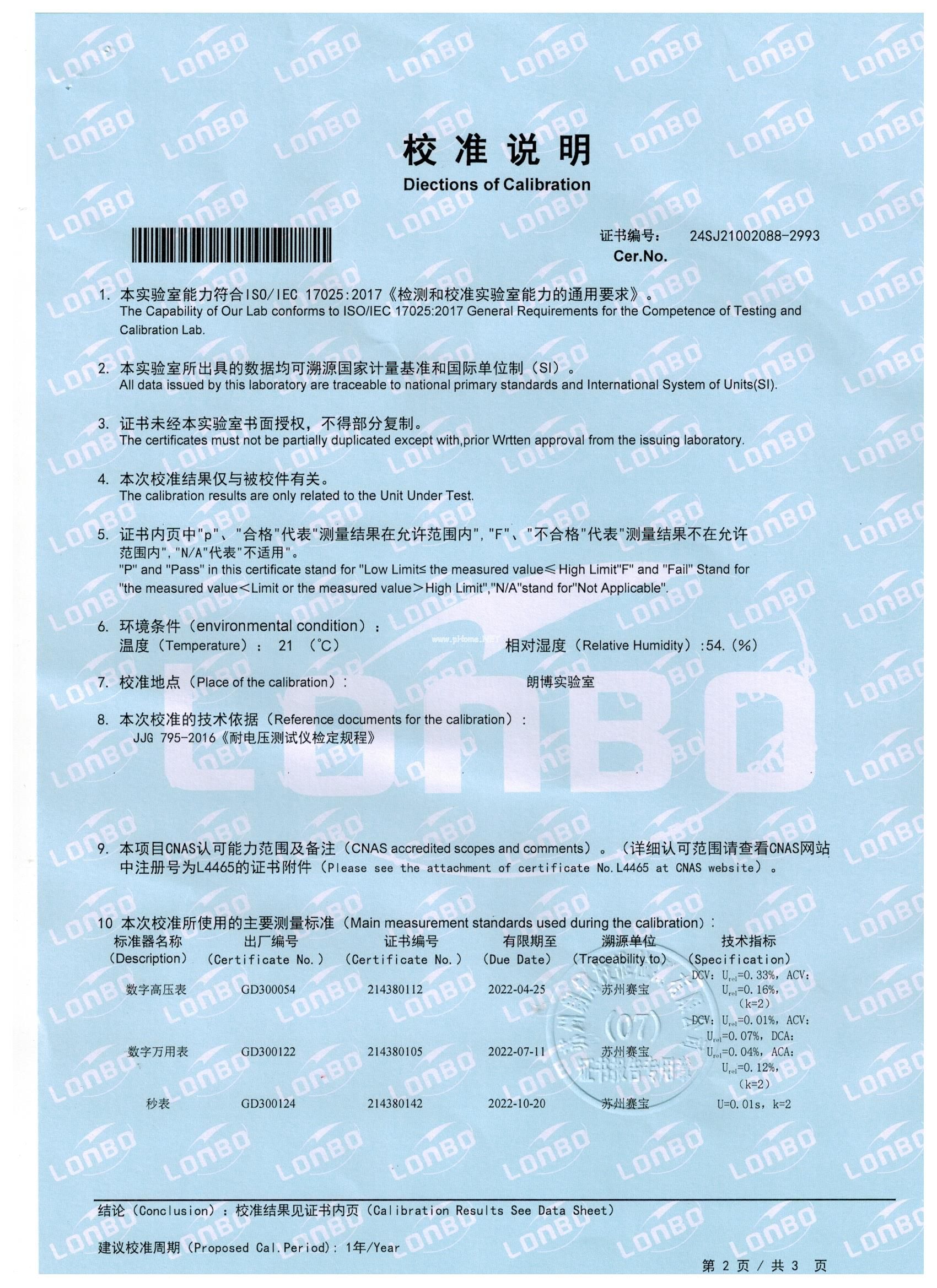工頻耐壓試驗(yàn)裝置,并由甲方委托蘇州朗博校準(zhǔn)檢測(cè)有限公司出具檢測(cè)報(bào)告。
