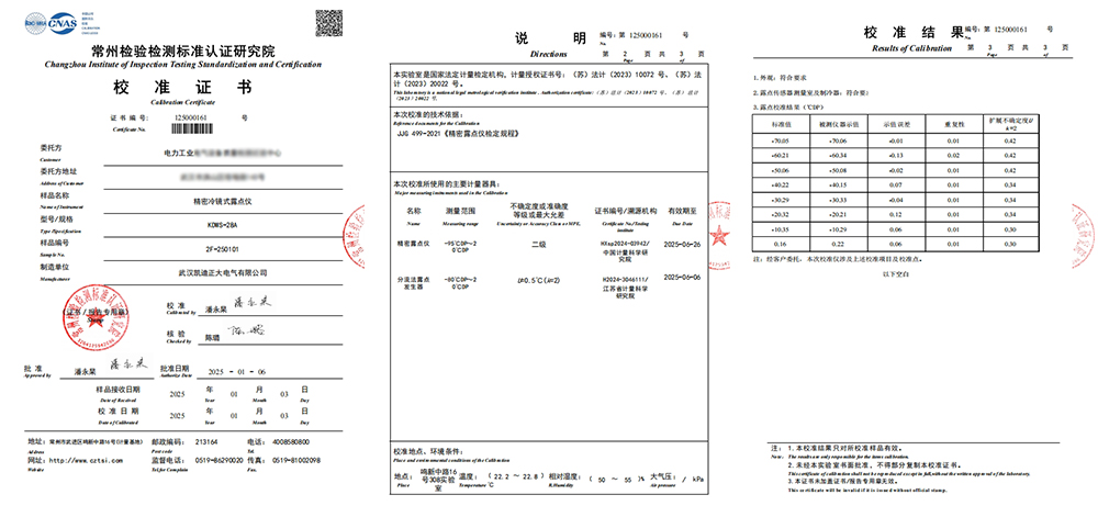 2025年1月3日,武漢凱迪正大電氣有限公司的KDWS-28A精密冷鏡式露點儀,成功通過了常州檢驗檢測標準認證研究院的嚴格校準,并榮獲校準證書,標志著該產品在工業(yè)氣體微水測量的可靠和精準性。