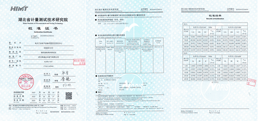 近日,電力工業(yè)電氣設備某中心采購的KDJB-702C微機繼電保護測試儀成功通過了湖北省計量測試技術研究院的嚴格校準,并順利獲得了校準證書。此采購標志著電力行業(yè)設備檢測單位對武漢凱迪正大電力產(chǎn)品的高度認可。