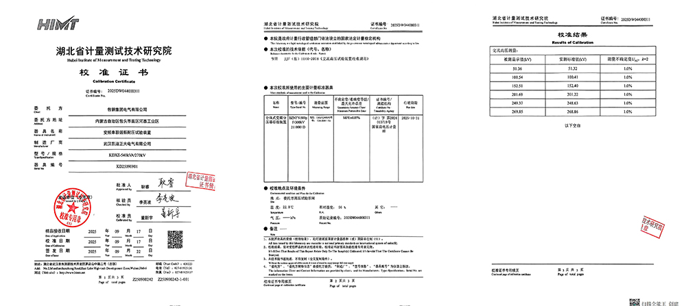 在電力設(shè)備制造與運(yùn)維領(lǐng)域,高壓耐壓試驗(yàn)是確保輸變電設(shè)備安全可靠運(yùn)行的關(guān)鍵環(huán)節(jié)。變頻串聯(lián)諧振耐壓試驗(yàn)裝置因其輸出波形純凈、效率高、對(duì)試品損傷小等優(yōu)勢(shì),已成為高壓試驗(yàn)的常用設(shè)備。近期,包鋼集團(tuán)電氣有限公司從武漢凱迪正大電氣有限公司采購(gòu)了兩套型號(hào)為KDXZ-540kVA/270kV的變頻串聯(lián)諧振耐壓試驗(yàn)裝置,湖北省計(jì)量測(cè)試技術(shù)研究院對(duì)其進(jìn)行校準(zhǔn)。2025年9月,兩套裝置均順利通過(guò)校準(zhǔn),獲得證書(shū)編號(hào)分別為2025DW044000312和2025DW044000311的校準(zhǔn)證書(shū)。