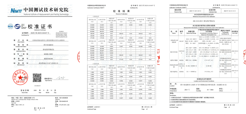 在電力系統(tǒng)安全穩(wěn)定運(yùn)行中,繼電保護(hù)裝置扮演著“安全衛(wèi)士”的角色,而其性能的可靠性則直接依賴于精準(zhǔn)的測(cè)試與校驗(yàn)。近日,武漢凱迪正大電氣有限公司成功向中國(guó)水利水電某工程局試驗(yàn)室交付了KDJB-1200Y 繼電保護(hù)測(cè)試儀(出廠編號(hào):KD25102303)。為確保儀器量值的準(zhǔn)確可靠,該設(shè)備已送至國(guó)家權(quán)威計(jì)量機(jī)構(gòu)——中國(guó)測(cè)試技術(shù)研究院(NIMTT) 進(jìn)行了全面、嚴(yán)格的校準(zhǔn),并順利獲得校準(zhǔn)證書(證書編號(hào):校準(zhǔn)字第202511101037號(hào))。這標(biāo)志著該儀器在電氣輸出、時(shí)間測(cè)量等關(guān)鍵性能指標(biāo)上均符合國(guó)家計(jì)量規(guī)范要求。