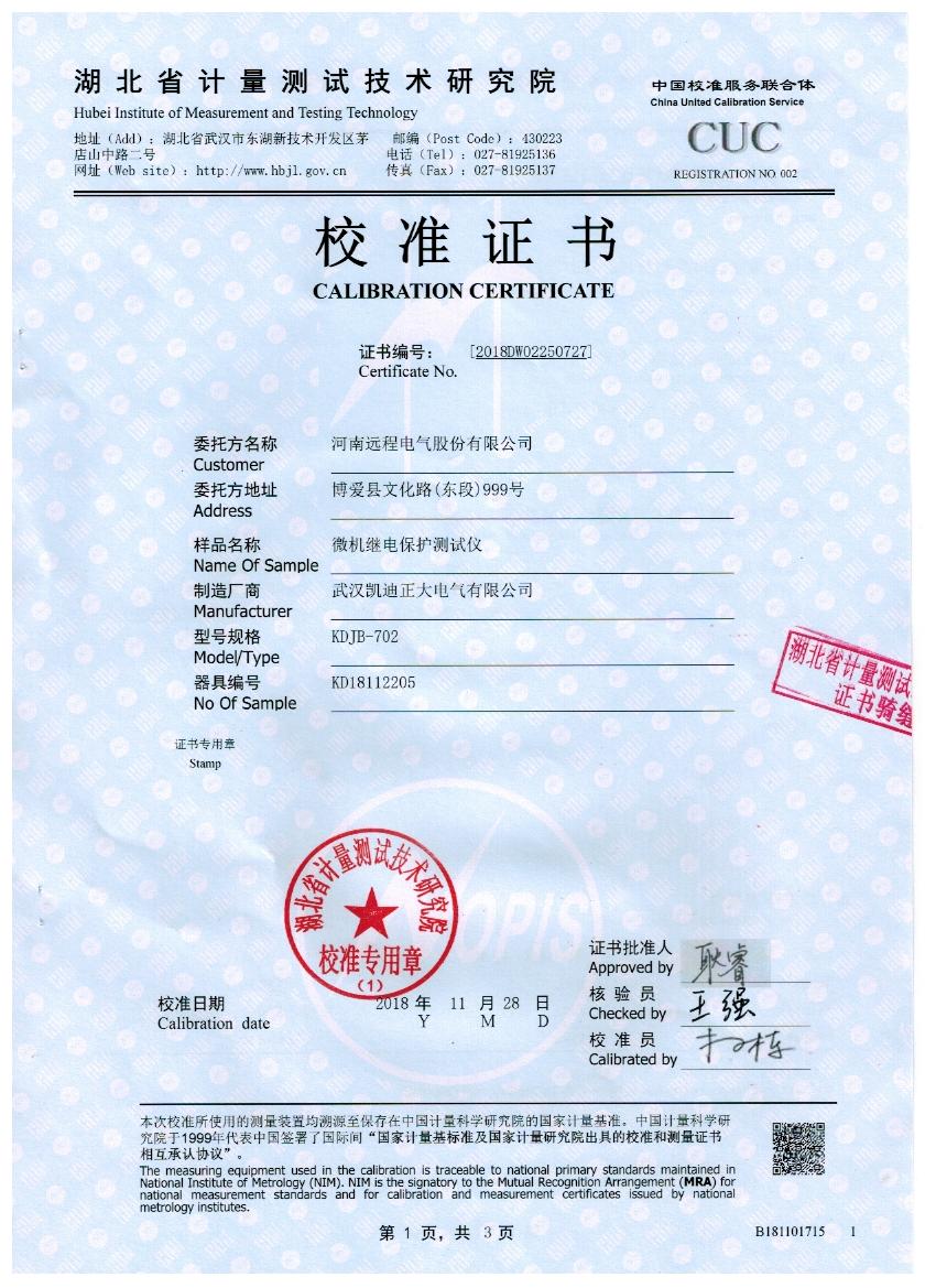 湖北省計量測試技術(shù)研究院是政府計量行政管理部門依法設(shè)立的法定計量檢定機(jī)構(gòu),本次校準(zhǔn)的技術(shù)依據(jù)是參照J(rèn)JG 1112-2015繼電保護(hù)測試儀,校準(zhǔn)所使用的主要計量設(shè)備數(shù)字多用表,型號/編碼:8508A,校準(zhǔn)環(huán)境溫度20.2度,相對濕度40度,校準(zhǔn)數(shù)據(jù)結(jié)果符合國家電力預(yù)試設(shè)備標(biāo)準(zhǔn)。