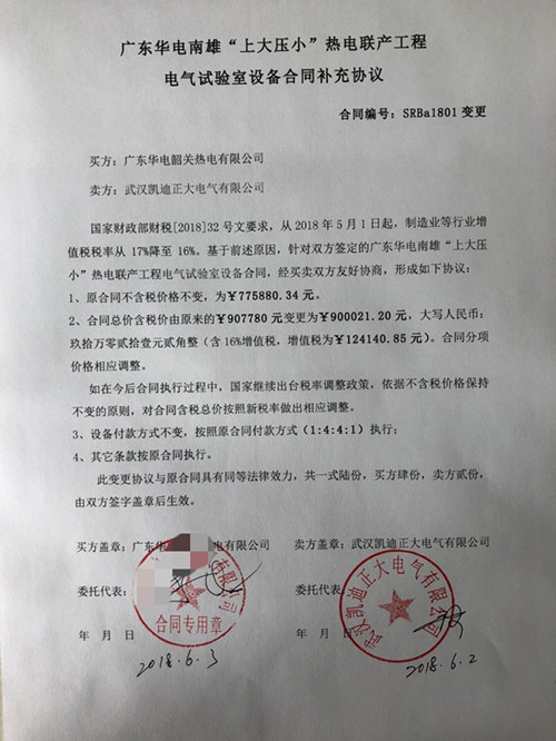 國家財(cái)政部財(cái)稅[2018]32號文要求,從2018年5月1日起,制造業(yè)等行業(yè)增值稅稅率從17%降至16%?;谇笆鲈颍槍﹄p方簽定的廣東華電南雄“上大壓小”熱電聯(lián)產(chǎn)工程電氣試驗(yàn)室設(shè)備合同,經(jīng)買賣雙方友好協(xié)商,形成如下協(xié)議: