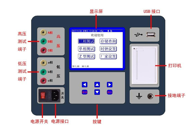 三相變比測試:用于常規(guī)三相變壓器變比與組別測量。